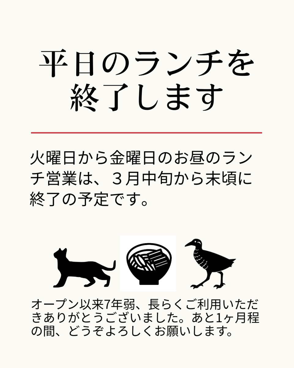 火曜日から金曜日の昼のランチ営業を終了します。終了時期は3月中旬から月末の間のどこかと考えています。はっきり決まり次第、お知らせします。
